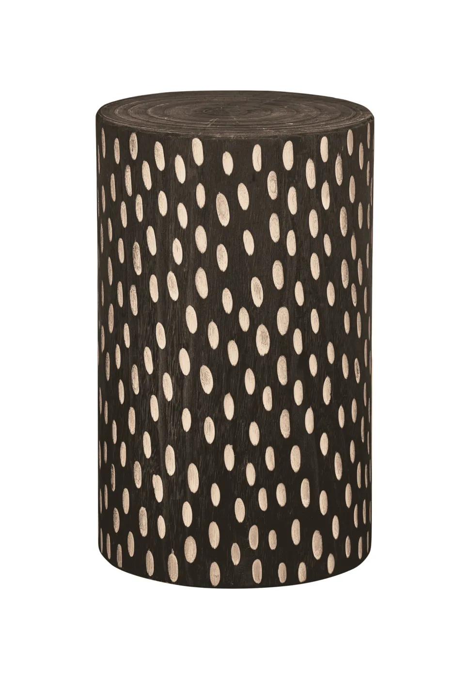 Perry uit de WOOOD Exclusive collectie is een opvallende kruk of bijzettafel, vervaardigd uit donkerbruin gekleurd paulowniahout. Het ontwerp onderscheidt zich door decoratieve, ovaalvormige patronen in een lichtere houtkleur, die speels contrasteren met de diepe basistoon. Deze subtiele tekening geeft het meubel een grafisch en retro karakter.