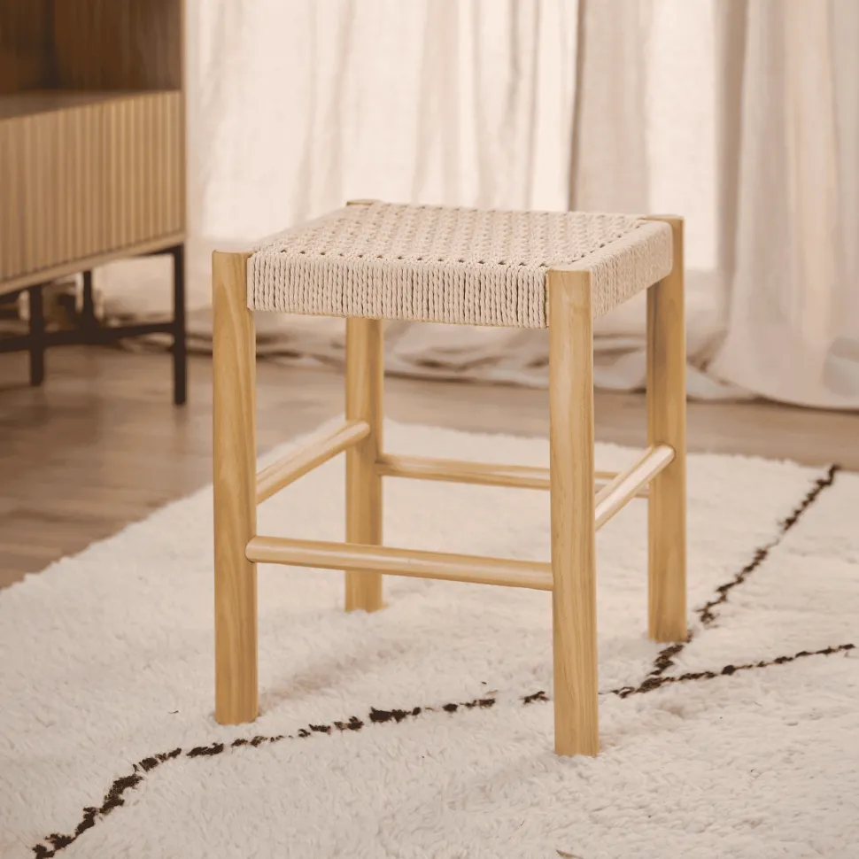Terugkerend naar de klassieke Scandinavische esthetiek, vangt deze kruk de schoonheid van eenvoudige vormen en natuurlijke materialen. De zitting is ingewikkeld geweven met een papieren koord, waardoor een intrigerend patroon ontstaat, en het omarmt het ronde frame van gelakt grenenhout. Hij doet het goed als decoratief object of als handige zitplaats voor één persoon ergens in huis.