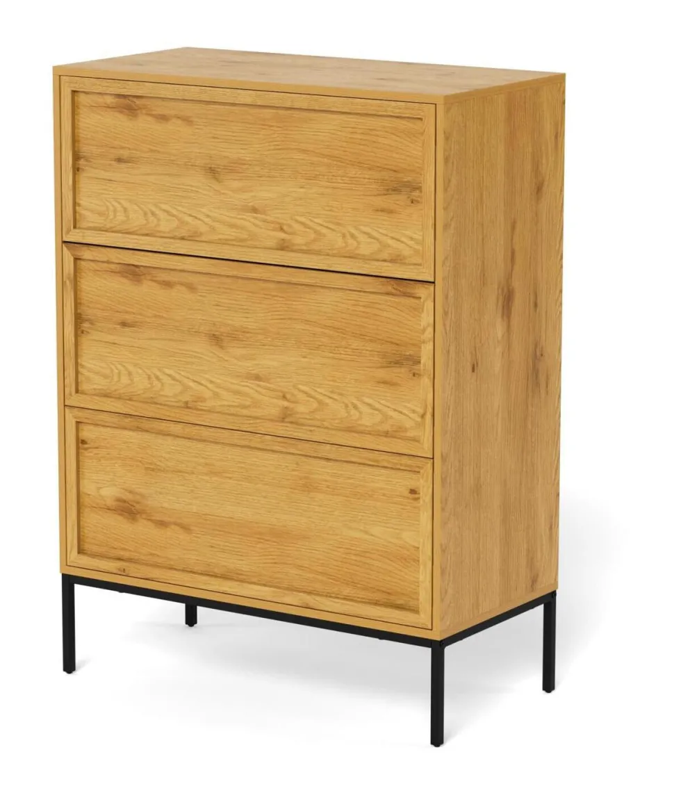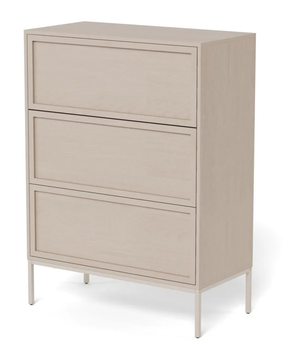 Deze ladekast helpt je om orde te bewaren en tegelijkertijd je ruimte te verrijken. Het ontwerp heeft een gemakkelijk te onderhouden grijs oppervlak en straalt een verfijnde sfeer uit. De drie push-to-open lades in een slank frame zijn omzoomd met latten, waardoor een gladde, chique voorkant ontstaat. De grijze vierkante stalen poten houden het ontwerp optisch licht.