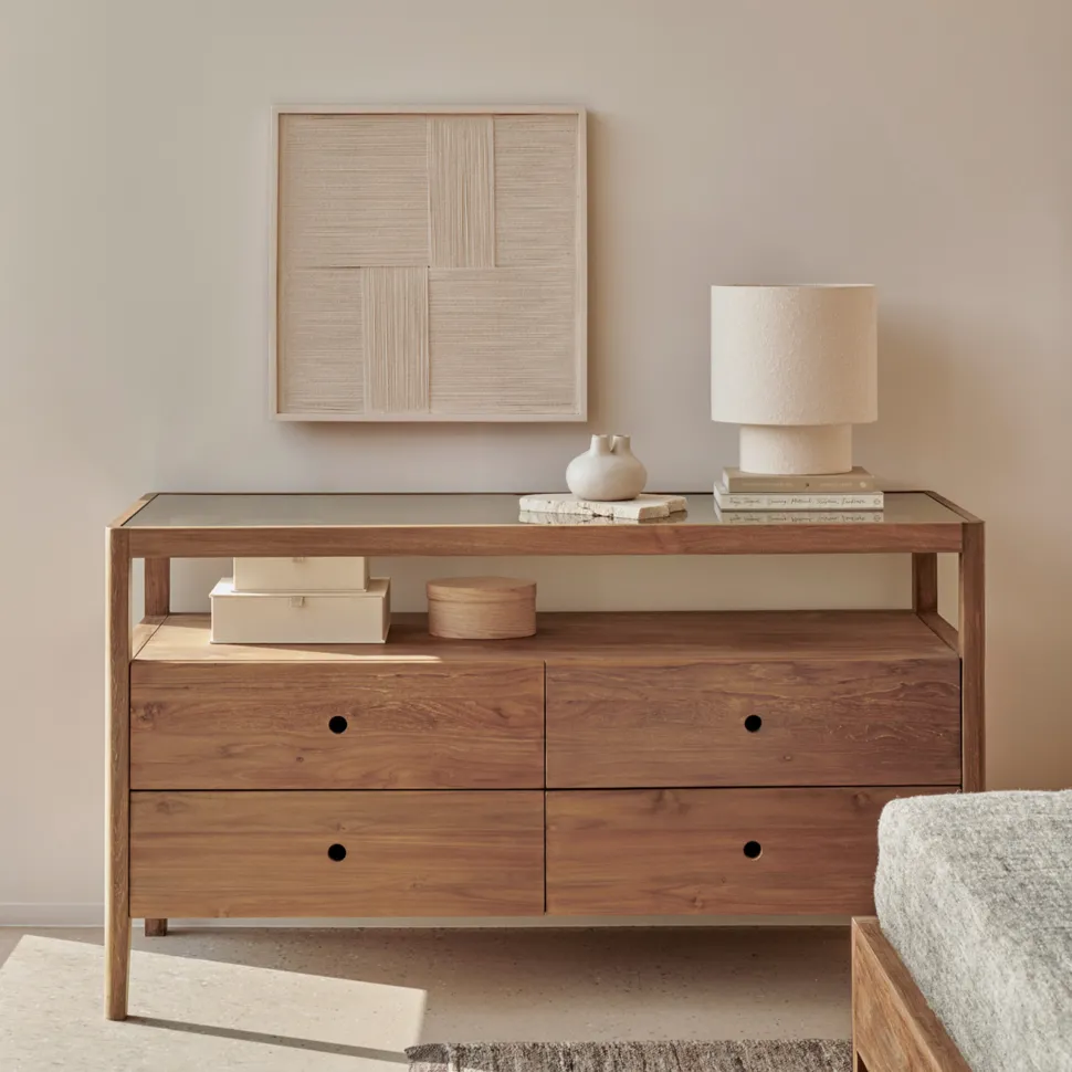 Ladekast Spindle Teakhout en glas, Met 3 laden, kleur Naturel