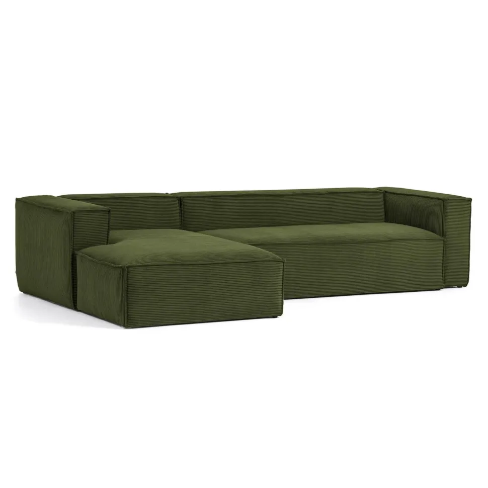 - 4-zitsbank met chaise longue bekleed met dik ribfluweel dat zeer zacht aanvoelt en een hoge weerstand heeft.