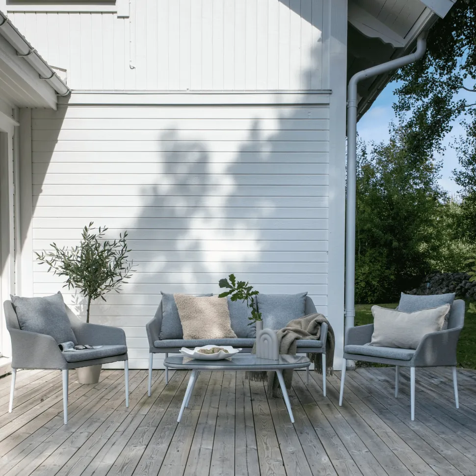 Felica is een moderne loungezit met een focus op comfort – hij past perfect op het terras of balkon. De meubelgroep bestaat uit een tweezitsbank en twee frame fauteuils. Bij de groep horen ook zwarte zachte kussens en een ovale lage salontafel met een tafelblad van helder glas dat een exclusief geheel vormt. Geniet van comfortabele zomeravonden in een aangename bankgroep!