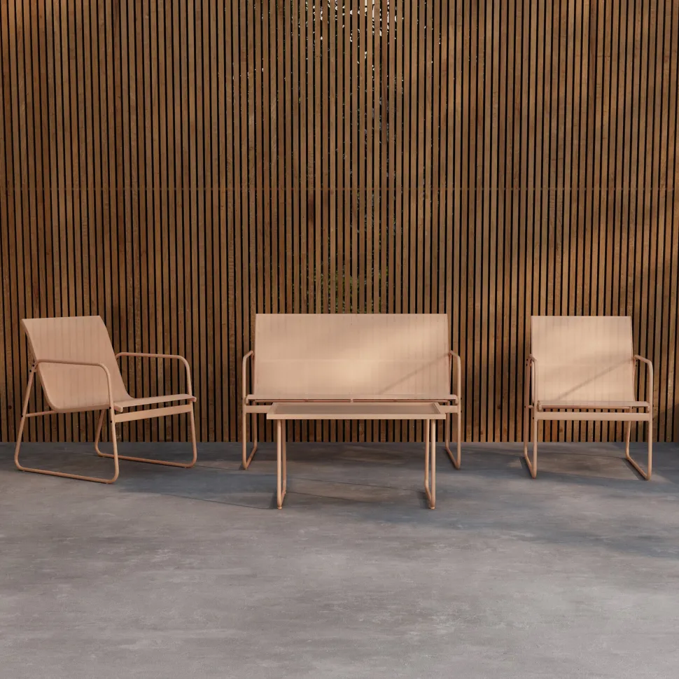 De Karilynn-bankstel in beige is een stijlvolle en handige meubelset die perfect past in zowel kleine als grote buitenruimtes. De set bestaat uit twee fauteuils, een bank en een bijpassende tafel – allemaal in een samenhangend ontwerp met een lichte en moderne uitstraling. De comfortabele stoelen maken het makkelijk om even te gaan zitten voor een kopje koffie of om te genieten van tijd met familie en vrienden, terwijl de neutrale beige kleur naadloos past in verschillende omgevingen. De Karilynn-bankstel is de logische keuze voor wie op zoek is naar een eenvoudige maar elegante meubeloplossing voor buiten.