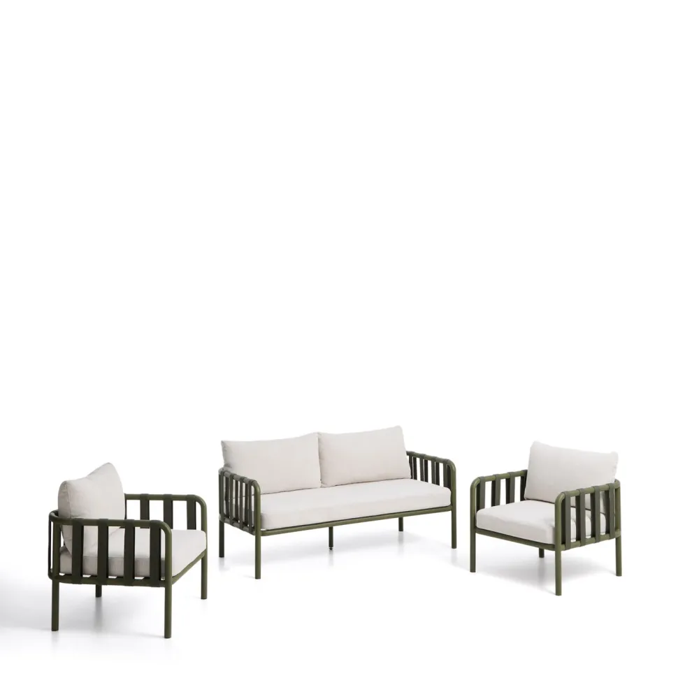 De Omala set is ontworpen om te genieten van je buitenmomenten. De aluminium structuur combineert lichtheid en sterkte, waardoor het uiterlijk intact blijft na verloop van tijd en blootstelling aan de buitenlucht. De rugleuning, gemaakt van weerbestendige banden, past zich aan het lichaam aan en bevordert een comfortabele houding. De kussens hebben afneembare hoezen voor eenvoudig onderhoud. We raden aan om de kussens op regenachtige dagen op te bergen om ze in goede staat te houden. Omala combineert duurzame materialen en zorg in elk detail om een bestendig en functioneel geheel te bieden. Elk meubel is voorzien van antislipbeschermers die de ondergrond beschermt en stabiele ondersteuning biedt.