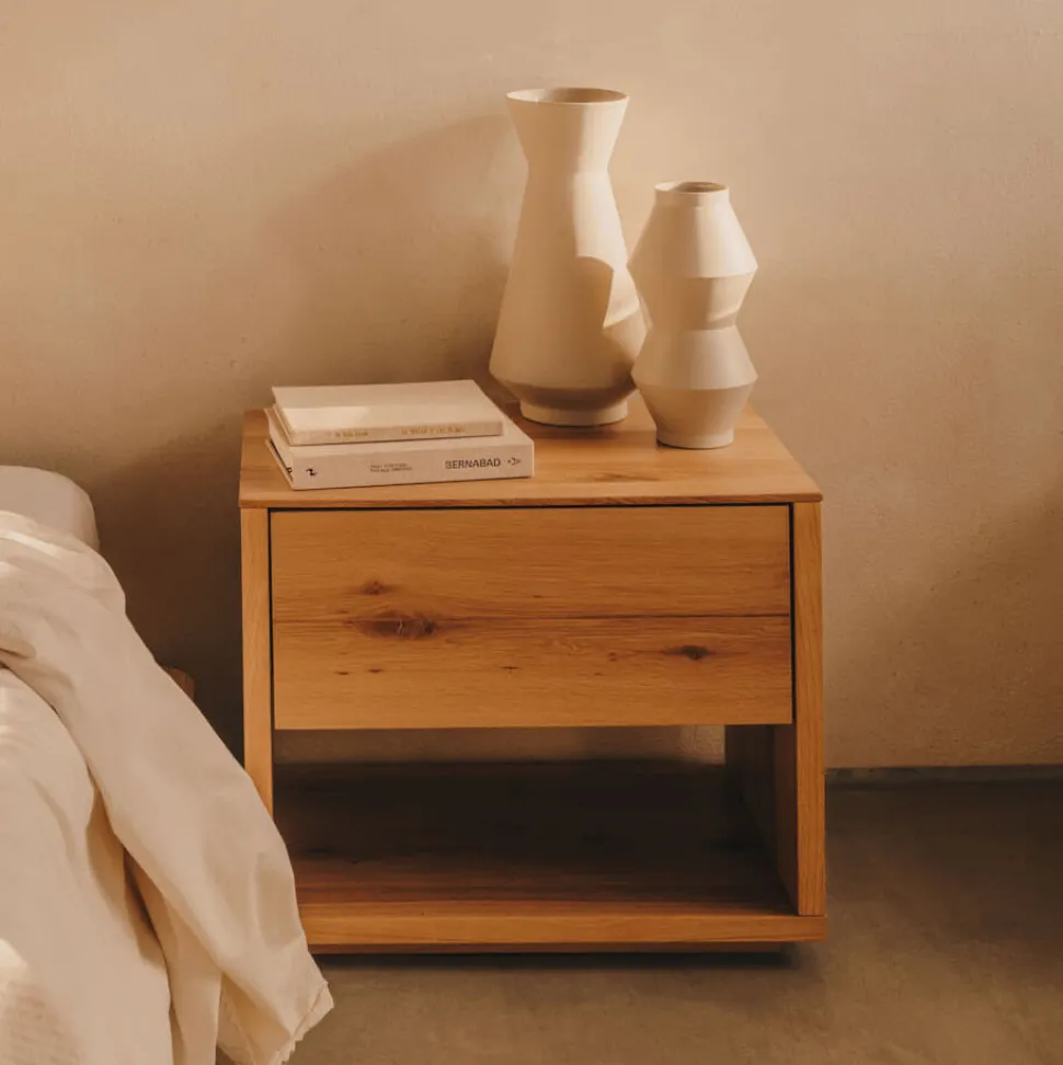 - Nachtkastje in eikenfineer met natuurlijke afwerking.