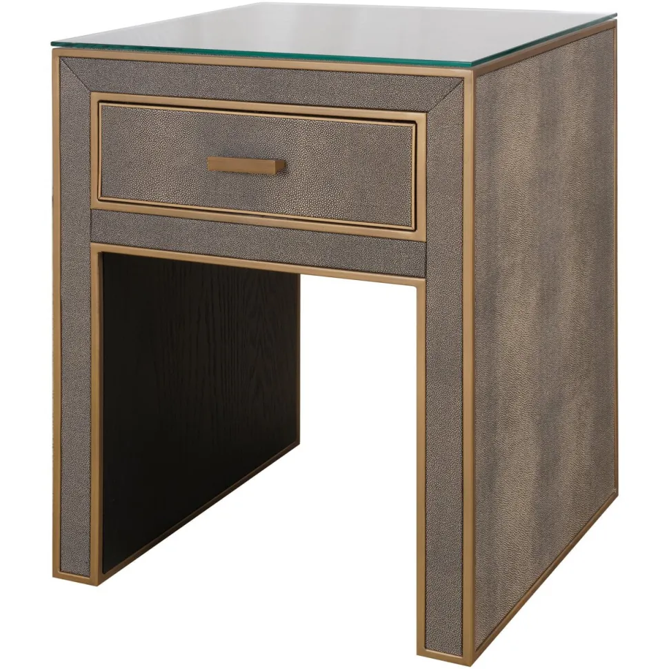 Het nachtkastje Bloomville met één lade straalt klasse uit door het gebruik van premium PU-leer, een glazen blad en verfijnde gouden details. Dit elegante ontwerp past perfect in een hotel chique slaapkamer en combineert praktische opbergruimte met een luxe uitstraling. De mix van rijke materialen en zachte texturen maakt dit nachtkastje een stijlvolle toevoeging naast ieder bed.
