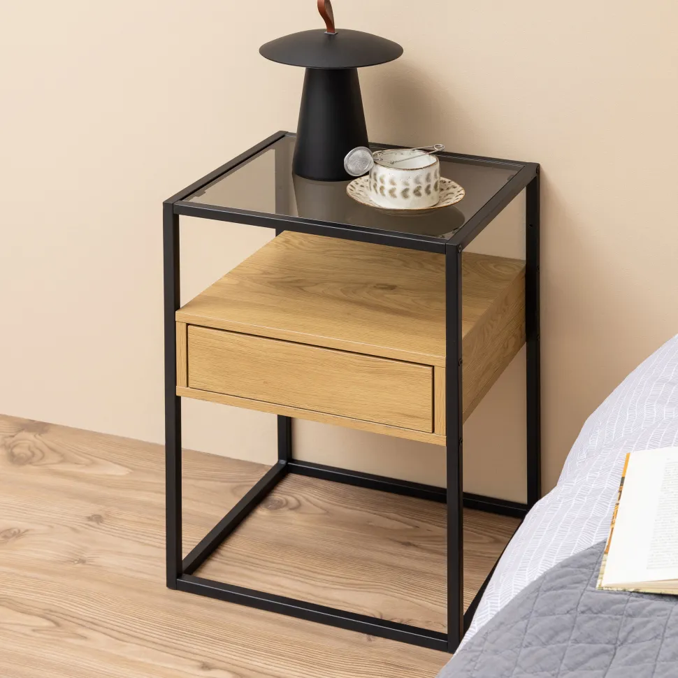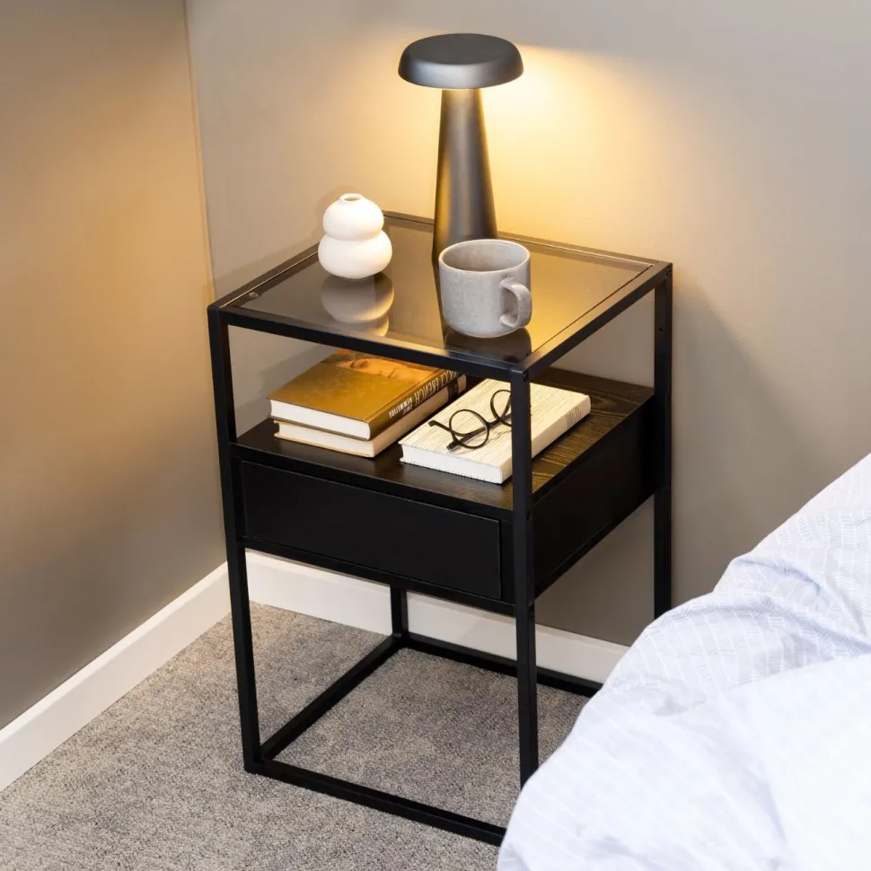 Nachtkastje ‘Maikel’ van Bendt is een stijlvolle mix van stoer en chic. Het zwarte metalen frame geeft een strak, industrieel randje, terwijl het rookglazen blad een vleugje luxe toevoegt. De lade is gemaakt van essenhout met een mooie, zichtbare houtstructuur – een subtiel detail dat warmte brengt in het geheel. Dankzij het push-to-open systeem oogt het nachtkastje clean en minimalistisch, zonder zichtbare handgrepen.