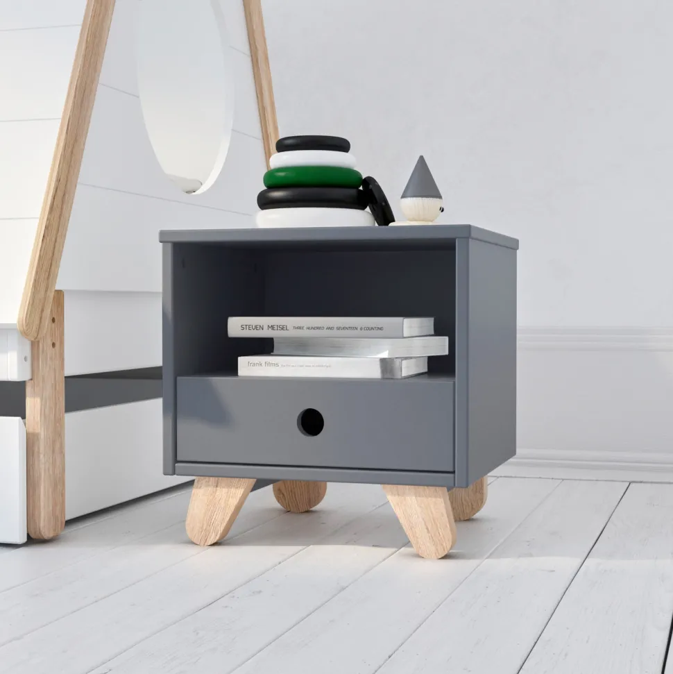Dit nachtkastje in klassiek Scandinavisch design biedt praktische opbergruimte voor bedlampje en boeken, nog een open vak voor gemakkelijke toegang en nog een lade voor extra opbergruimte. De Scandinavisch-moderne kleurencombinatie van de witgelakte romp en het natuurlijke hout maken het nachtkastje tot een blikvanger. De eenvoud wordt onderstreept door de greeploze look met vingergaten. Schuine poten van grenenhout geven het nachtkastje een bijzonder moderne uitstraling.