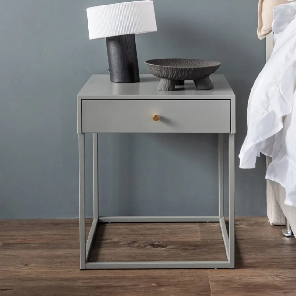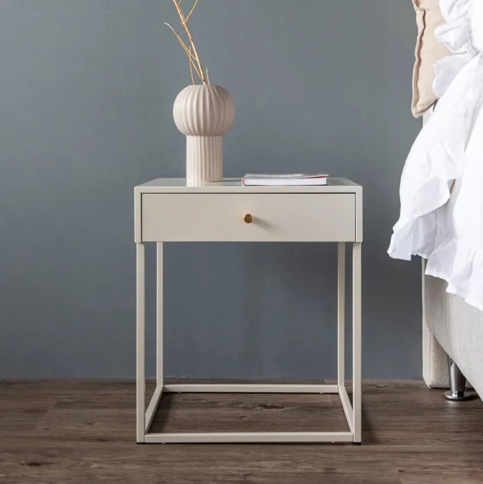 Met een toffe mix van tijdloos design en Scandinavische inspiratie verandert dit stijlvolle beige nachtkastje je slaapkamer in een plek waar stijl en orde samenkomen. Het nachtkastje heeft een handige lade voor verborgen opbergruimte, versierd met een mooie messingkleurige knop die het geheel helemaal afmaakt. Bewaar je avondboek, bril of kleine schatten handig binnen handbereik.