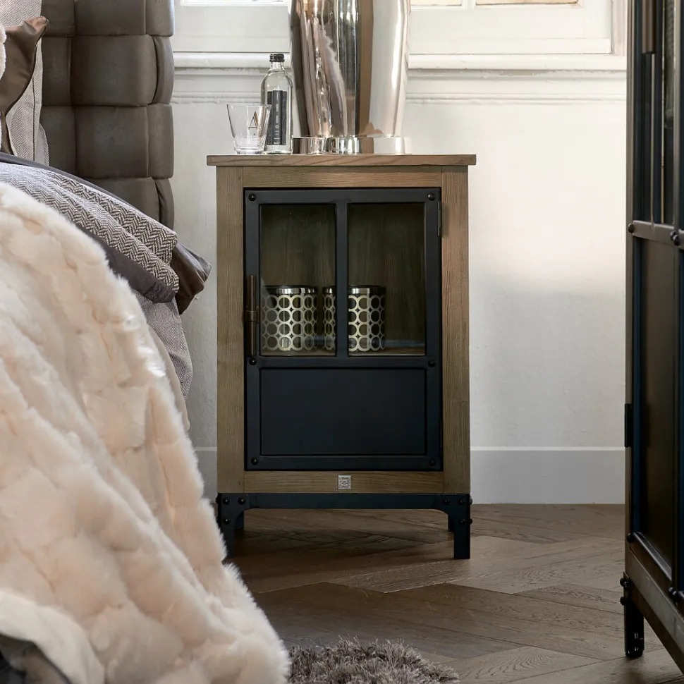 Het nachtkastje uit de Hoxton-serie is net als de andere items uit deze lijn gemaakt uit een combinatie van gerecycled essenhout, zwartgekleurd ijzer en glazen panelen die het kastje afsluiten voor vuil en stof. Bij de Hoxton nachtkastjes wordt onderscheid gemaakt in een kastje voor de linkerzijde van het bed en een kastje voor de rechterzijde. Het verschil zit in de positie van de handgreep.