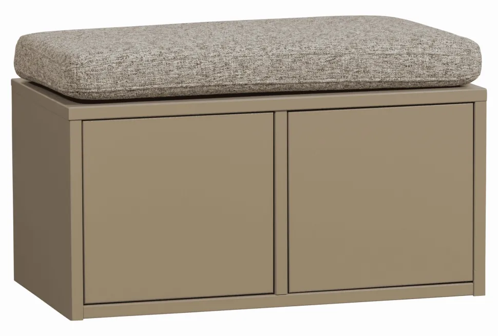 De Turner opbergbank van WOOOD is gemaakt van grenenhout en uitgevoerd in de zachte, aardse kleur Mud. Het ontwerp is stijlvol minimalistisch, met heldere lijnen en een rustige uitstraling. De voorkant bestaat uit twee strakke deurtjes, subtiel verwerkt in het geheel. Op de bank ligt een stoffen kussen zodat je comfy kunt zitten, of dat nu in je hal is of aan de eettafel.