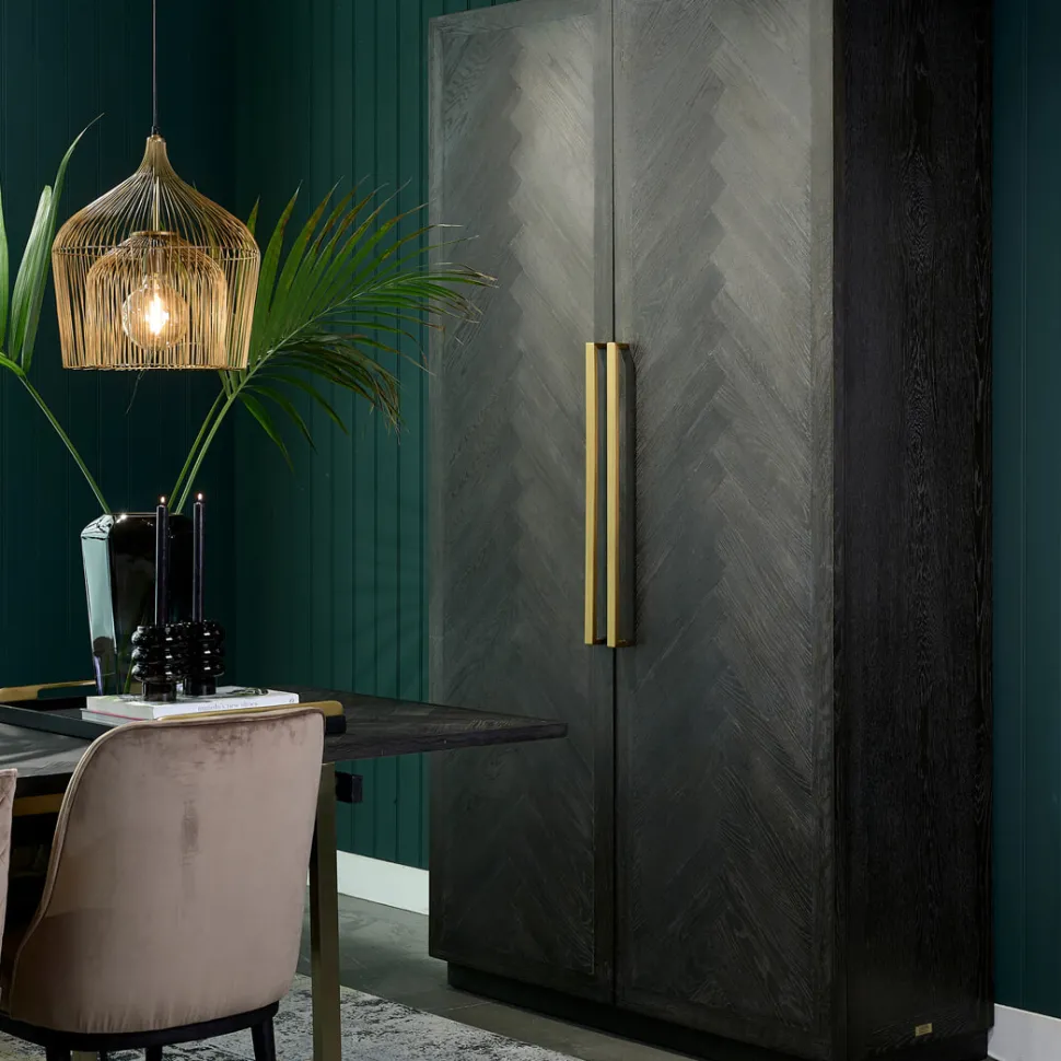 Nieuw in de 5th Avenue-serie, een royale kast van wel 2.23 meter hoog. Een ideale opbergkast waar je veel in kwijt kunt. Achter de deuren, met softclose-systeem, bevinden zich meerdere diepe planken. De kast is gemaakt van donker gebeitst gerecycled eikenhout, met zacht gouden, metalen handgrepen als finishing touch. Deze kast matcht perfect bij de Costa Mesa-serie. Tip: gebruik voor het onderhoud de Premium Wood Care Kit.