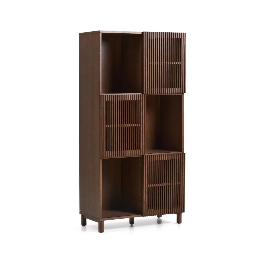 De Beyla opbergkast van Kave Home brengt een verfijnde, Japandi uitstraling in huis. Gemaakt van eikenfineer met massief eikenhouten schuifdeuren en poten, straalt de kast natuurlijke eenvoud en warmte uit. Het ontwerp speelt met openheid en structuur: drie dichte vakken zijn afgeschermd met schuifdeuren voorzien van verticale latjes, waar je subtiel half doorheen kunt kijken.