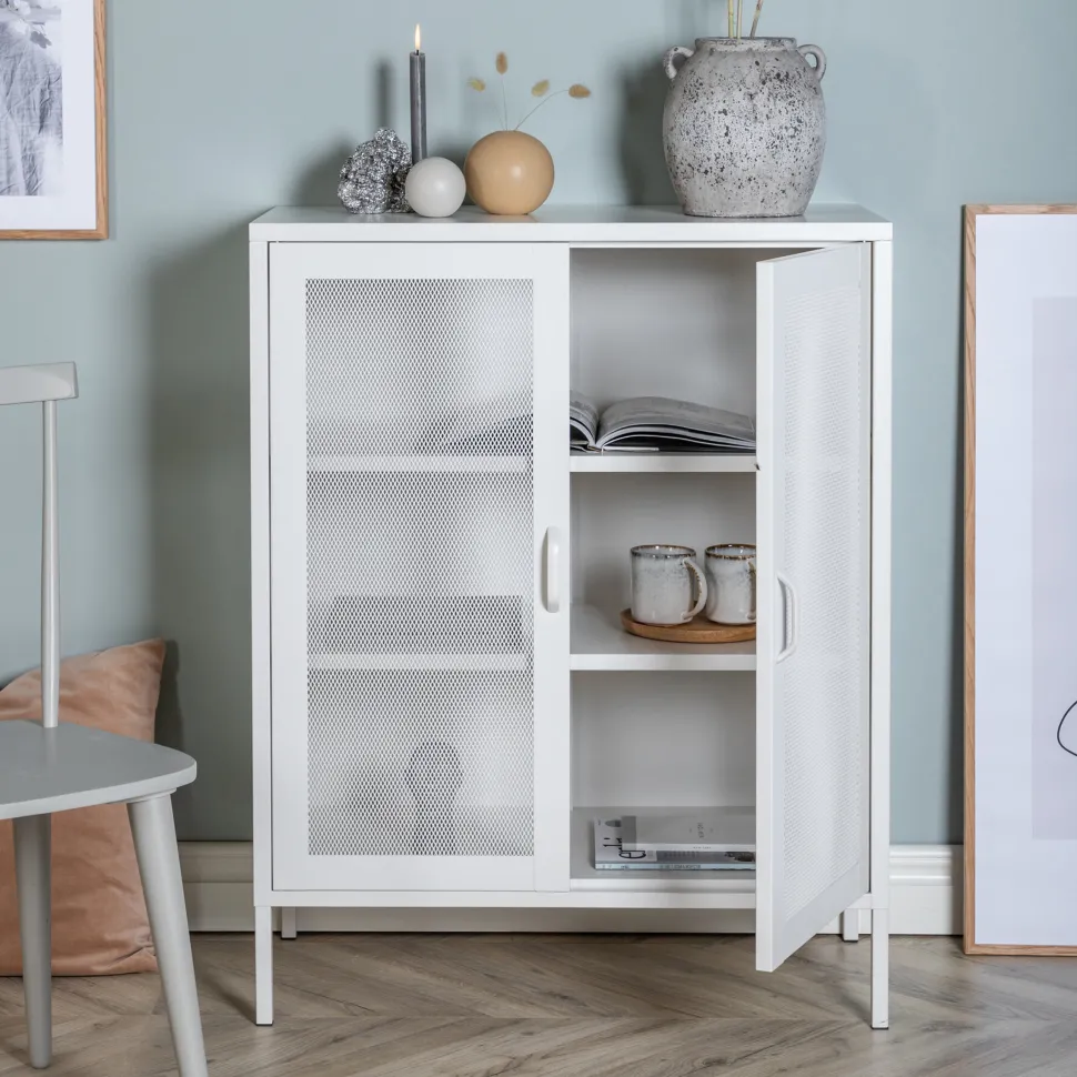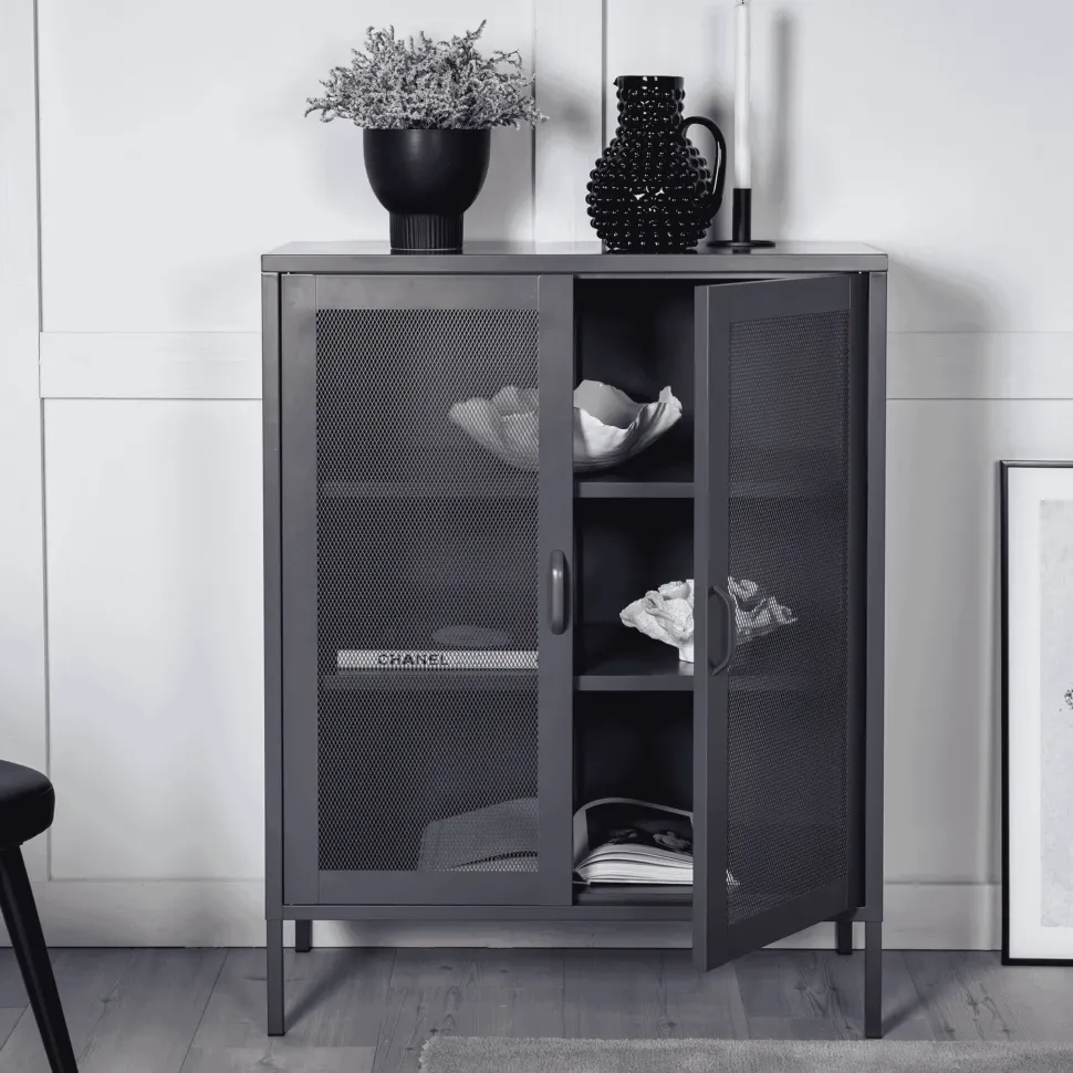 Carmilla, in een stoer industrieel ontwerp met heerlijke gaasdeuren en botten van grijs gepoedercoat staal met 3 slimme reliëfvlakken. De kast wordt opgetild door smalle, hoge poten die een luchtig gevoel creëren en ook de stofzuiger vergemakkelijken. Het perfecte opbergmeubel voor alles wat je maar wilt – vullen met porselein, boeken of mooie decoraties. Het flexibele formaat van de kast maakt hem gemakkelijk te plaatsen en past goed in de meeste kamers in huis, dus richt hem in volgens je eigen behoeften en wensen!