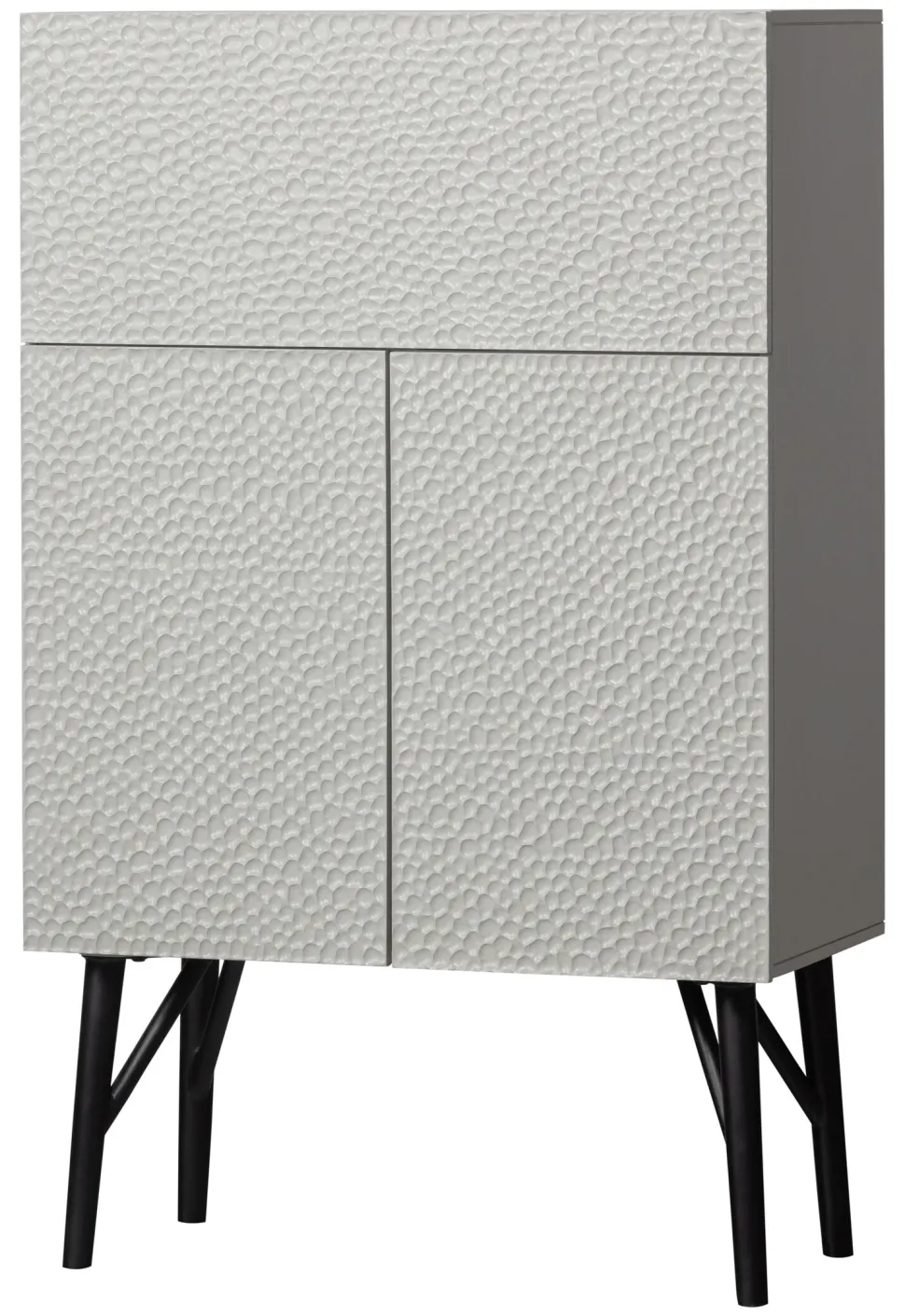 De corpus van de Carved Organic-serie is gevormd uit, 15 mm grenenhout met een geschuurde afwerking. Deze afwerking geeft het meubel een zeer gladde en nette uitstraling. Het item is gekleurd in een mistgrijze tint. Het interieur is vervaardigd uit mistgekleurd spaanplaat, de achterzijde is van HDF met dezelfde mistkleur.