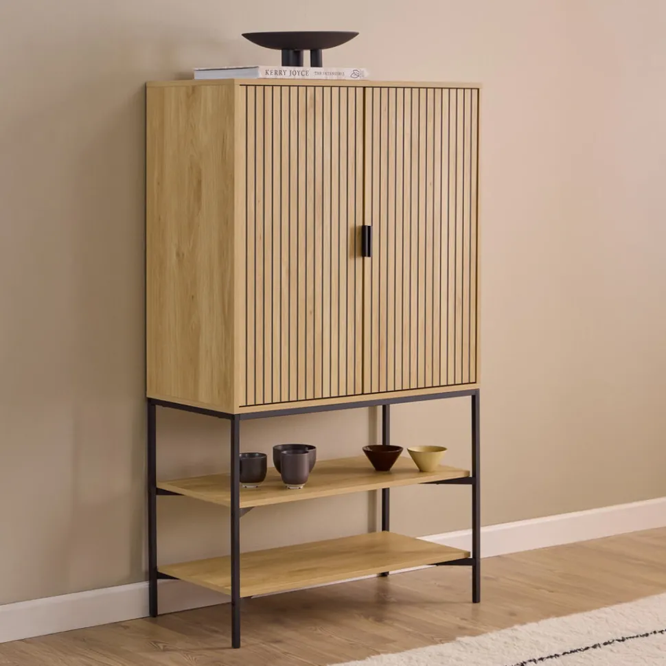 Met zijn minimalistische look is deze kast meer dan alleen een plek om je spulletjes in op te bergen – het is een pronkstuk. De eikenhouten look en de latten aan de voorkant in combinatie met de zwarte stalen elementen geven elk huis een moderne, contrasterende look. Het dressoir heeft een gemakkelijk schoon te maken oppervlak, 2 deuren en 3 planken en biedt handige opbergruimte.