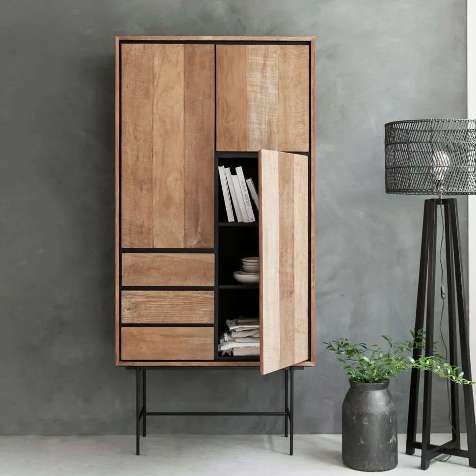Opbergkast Metropole is gemaakt van gerecycled teakhout en afgewerkt met een zwart metalen frame. De Metropole collectie kenmerkt zich door het verjongen van de randen van kastdeurtjes en tafelbladen. De hoge opbergkast heeft 3 deurtjes en 3 lades en heeft een afmeting van 210x100x40 cm.