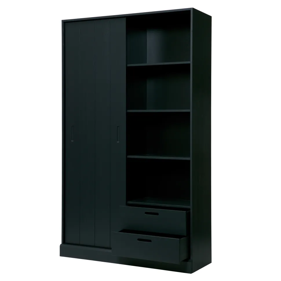 - De kast heeft een breedte van 120 cm en beschikt over 9 grote opbergvakken en een handige schuifdeur