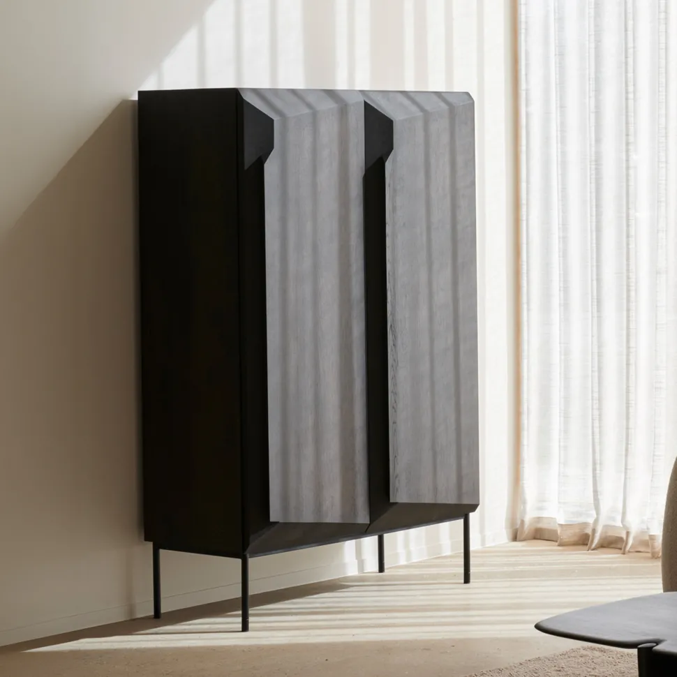 Een hoekig design, ontworpen door Alain van Havre, vormt het hart van deze creatie waarin er afstand wordt genomen van traditionele statische en onbeweeglijke oppervlakken. Een uniek gevoel van volume wordt gecreëerd en verandert uw waarneming van de opbergkast terwijl u erlangs loopt.