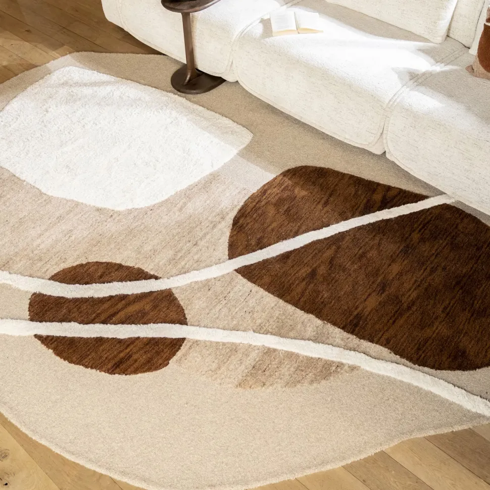 Het organisch vloerkleed Ogani van By-Boo is een kleurrijke wollen blikvanger voor je interieur. Met verschillende vormen en tinten zoals beige, off-white en bruin, brengt het kleed een speels en warm effect in elke ruimte. Door deze kleuren terug te laten komen in je interieur, bijvoorbeeld met kussens op de bank of andere accessoires, creëer je een harmonieus en samenhangend geheel.
