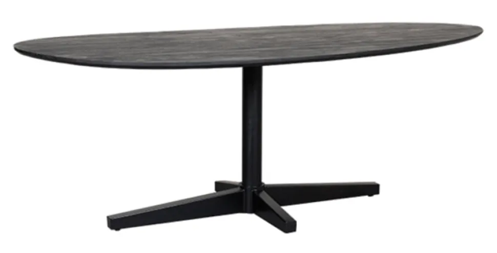 Gemaakt van Zwart Mangohout, biedt het blad een luxe uitstraling. De rijke textuur en donkere kleur van het hout voegen een stijlvolle touch toe aan je interieur. De tafelpoot bestaat uit stevig zwart metaal en heeft een centrale positie onder het tafelblad.