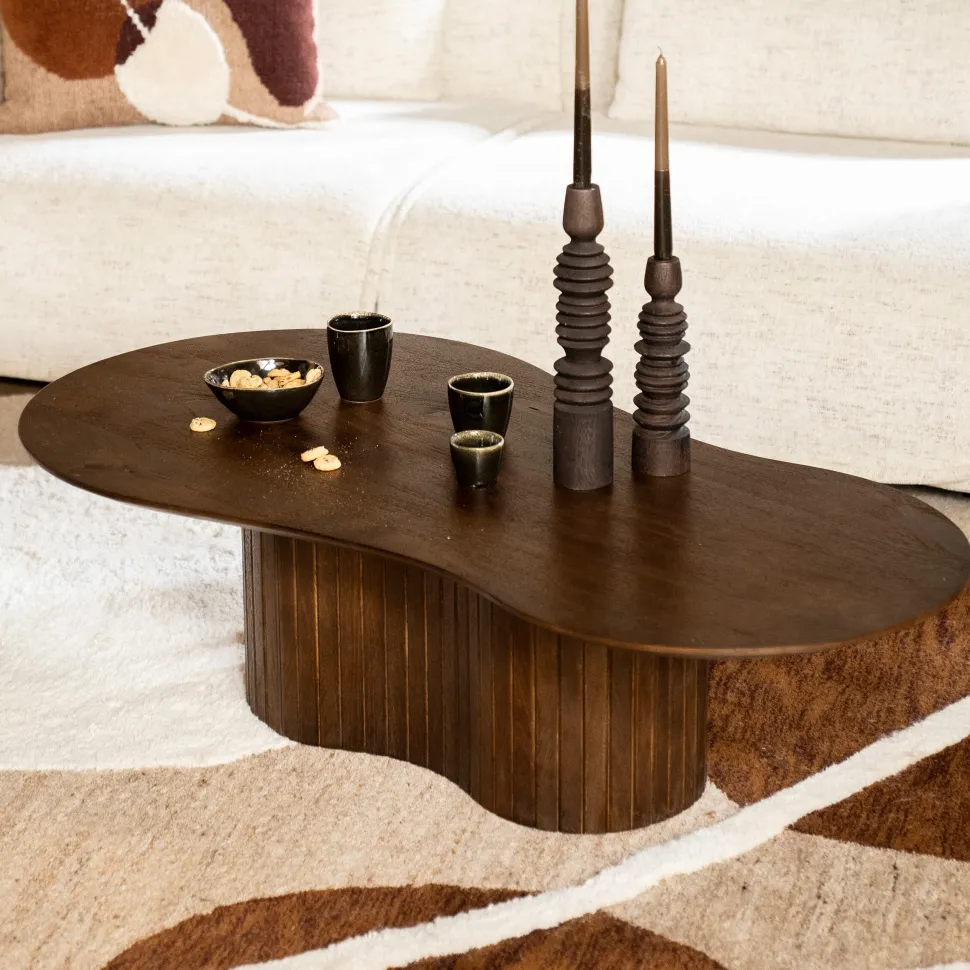 De organische salontafel ‘Jordy’ combineert elegantie en een opvallend design. Gemaakt van mangohout, valt de tafel uit de collectie van Eleonora op door zijn unieke organische onderstel met verfijnde latjes, wat de tafel een speels en luchtig karakter geeft. Dankzij de gelakte donkere afwerking voegt deze tafel warmte en diepte toe aan je interieur.