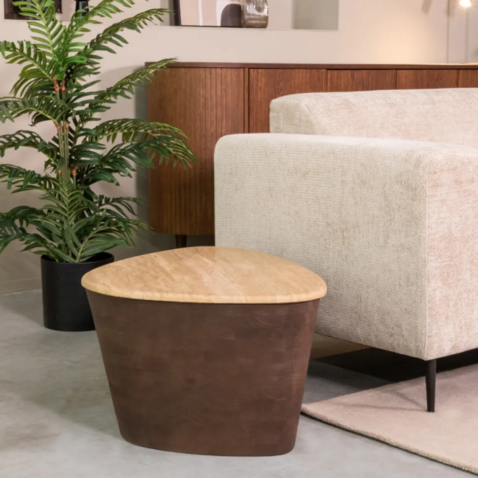De Ravi salontafel is een prachtig meubelstuk, gemaakt van Espresso Sandblasted Mangohout. De keuze voor hout zorgt voor een warme en uitnodigende sfeer in je woonkamer. Het blad van travertin, een trendy natuursteen, voegt een luxe accent toe met zijn variërende tinten van crème tot beige met unieke aderingen. Deze combinatie geeft elke tafel een authentiek karakter, perfect voor het creëren van een gezellige ambiance in je huis.