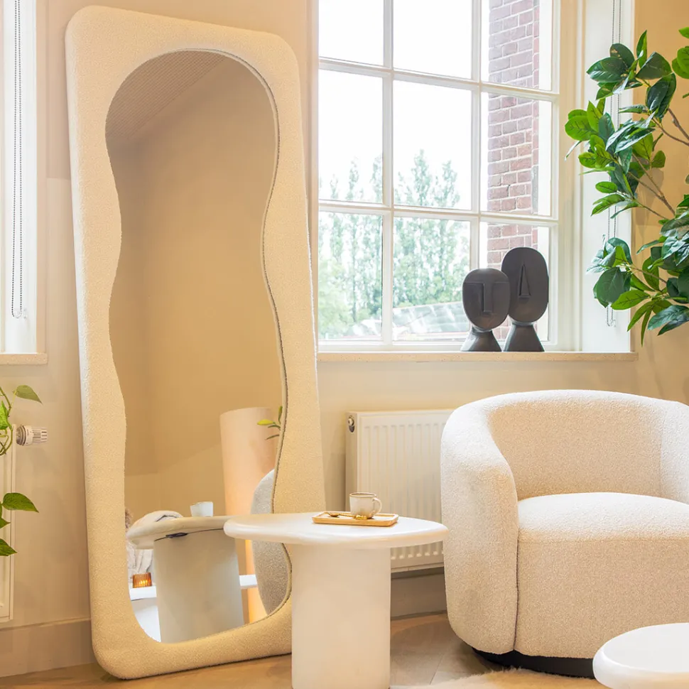 Spiegel ‘Evol’ van By-Boo is een speelse, organisch gevormde spiegel met een opvallende en zachte witte bouclé rand. De bijzondere textuur van de stof contrasteert prachtig met het gladde spiegelglas en voegt een verrassend, aaibaar element toe aan je interieur.
