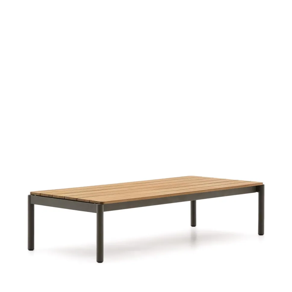 Aquí tienes el texto revisado para sonar más natural en neerlandés: De salontafel van aluminium met een teakhouten blad is een meubelstuk dat functionaliteit, design en duurzaamheid combineert om elke buitenruimte te verfraaien. Exclusief ontworpen voor Kave Home door Made Studio, heeft de tafel een lichtgewicht aluminium frame dat tegelijkertijd zeer sterk is. Dit maakt het ideaal voor langdurig gebruik buiten, aangezien het bestand is tegen oxidatie, corrosie en de schadelijke effecten van UV-stralen. Het teakhouten blad voegt een extra dosis verfijning en warmte toe, en staat bekend om zijn uitzonderlijke weerstand en duurzaamheid in buitenomgevingen. Dit edele materiaal is perfect bestand tegen vocht, waardoor het zelfs onder de meest veeleisende omstandigheden zijn kracht behoudt. Met een ontwerp dat gericht is op veelzijdigheid, kan deze tafel perfect worden gecombineerd met andere tafels uit dezelfde collectie. Zo kun je sets van verschillende hoogtes creëren die passen bij jouw stijl en wensen. Het elegante afwerkingsniveau geeft een frisse, moderne uitstraling en past moeiteloos in elke buitenomgeving. Het is het ideale meubel voor wie op zoek is naar tijdloos design, zonder concessies te doen aan kwaliteit of functionaliteit. Met Sorells stel je jouw ideale bank samen, door de modulaire elementen af te stemmen op jouw persoonlijke behoeften en levensstijl. Het is de perfecte combinatie van modern design, hoogwaardige materialen en comfort, die jouw buitenmomenten opnieuw definieert.
