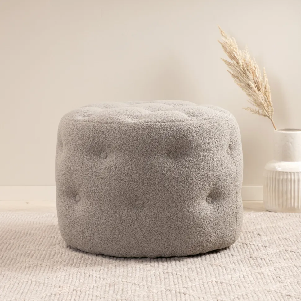 Richt je huis slim en stijlvol in! Melony in pluizige teddystof is een cilindervormige, multifunctionele poef in een grijsgroene kleur met decoratieve diepzittende en gestoffeerde knopen die zorgen voor een elegant totaalontwerp. De zachte vormen en dikke vulling maken de poef comfortabel om op te zitten, en hij werkt uitstekend als extra zitplaats als er veel gasten zijn. Gebruik hem ook als voetensteun, tijdelijk opbergoppervlak of zet hem solo neer als stijlicoon – jij beslist! Gemaakt van schuim, katoenvezel, teddystof en gebogen hout. Afmetingen van de poef: Hoogte: 44 cm, diameter: 55 cm.