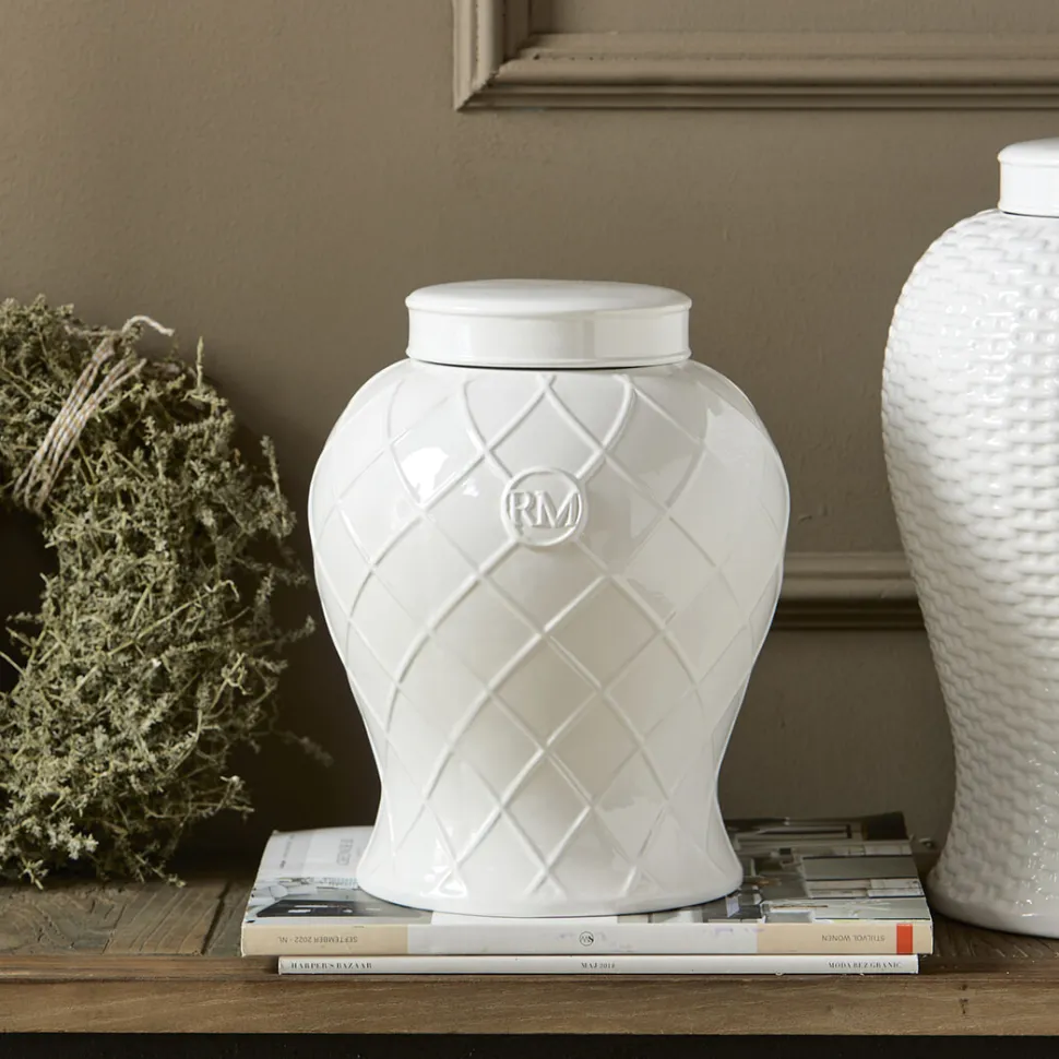 Deze prachtige gemberpot RM Piombino is het perfecte accessoire voor liefhebbers van stijlvol wonen. Met zijn handgemaakte porseleinen vorm en siliconenring sluit het deksel perfect af. Het ruitpatroon zorgt voor een speels accent, en de RM button maakt het geheel af. Prachtig om te zien en fijn om te gebruiken!