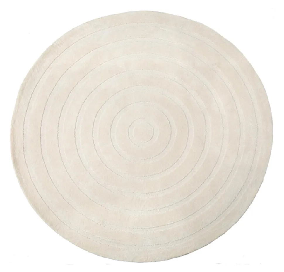 Het vloerkleed heeft een ronde vorm en valt op door zijn strakke lijnen en geometrische patroon. De cirkelvormige lijnen creëren een subtiel maar opvallend design, wat zorgt voor een speels effect zonder te overheersen. Dankzij de ronde vorm breekt het kleed de rechte lijnen in een ruimte, wat het geheel zachter en harmonieuzer maakt.