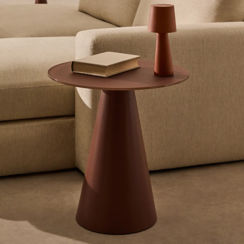 - Bijzettafel met gehard glazen blad met anti-vingerafdrukcoating en conisch stalen onderstel.