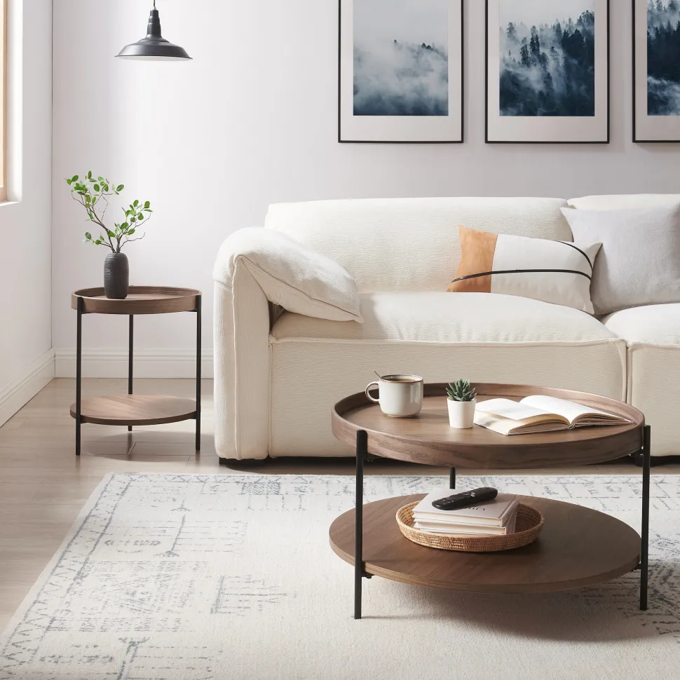 De moderne salontafel set van 2 in de elegante kleur eiken combineert hedendaagse esthetiek met praktische functionaliteit. Hij is ideaal voor woonkamers die zowel een stijlvolle uitstraling als extra opbergruimte nodig hebben. De set bestaat uit twee tafels van verschillende afmetingen, die elkaar harmonieus aanvullen en op verschillende manieren gebruikt kunnen worden. Samen geplaatst als een aantrekkelijk geheel of afzonderlijk, bieden deze tafels flexibele gebruiksmogelijkheden die perfect passen bij verschillende woonwensen. De grotere tafel meet 69x69x39 cm en biedt een royaal opbergoppervlak dat ideaal is voor het plaatsen van decoratieve voorwerpen, boeken of je ochtendkoffie. De kleinere tafel meet ca. 44x44x49 cm en is dankzij zijn compacte vorm ideaal als bijzettafel, bijvoorbeeld naast een fauteuil of bank. Beide tafels hebben elk twee planken, wat extra opbergruimte biedt en de woonruimte opgeruimd houdt. De tafelbladen zijn gemaakt van vezelplaat met gemiddelde dichtheid (MDF), dat bekend staat om zijn stabiliteit en duurzaamheid. Ze zijn afgewerkt met een fineer van fijn essenhout, dat is gelakt in een subtiele eikenkleur. Dit zorgt niet alleen voor een warme, natuurlijke uitstraling, maar ook voor een gemakkelijk te onderhouden en slijtvast oppervlak. Het frame van de tafels is gemaakt van mat metaal met poedercoating, wat de moderne uitstraling benadrukt en tegelijkertijd zorgt voor een robuuste constructie.