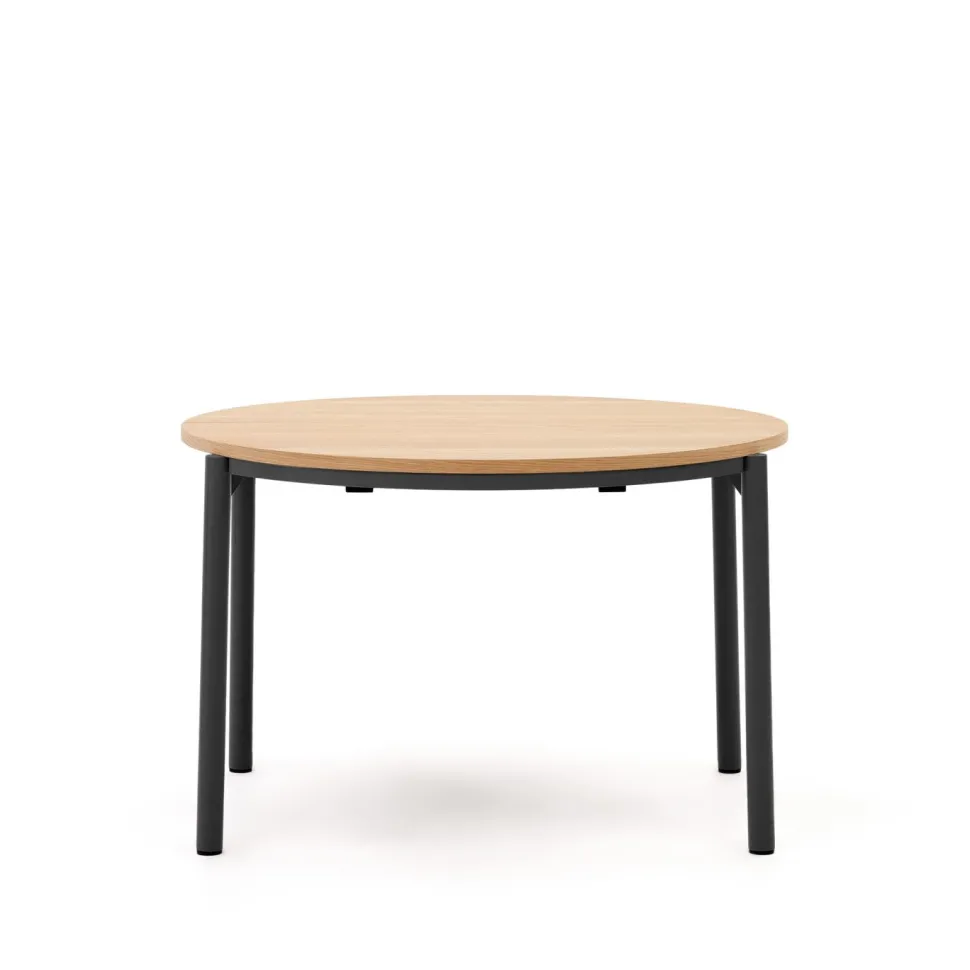 - Ronde uitschuifbare tafel van eikenfineer en stalen grijze poten.