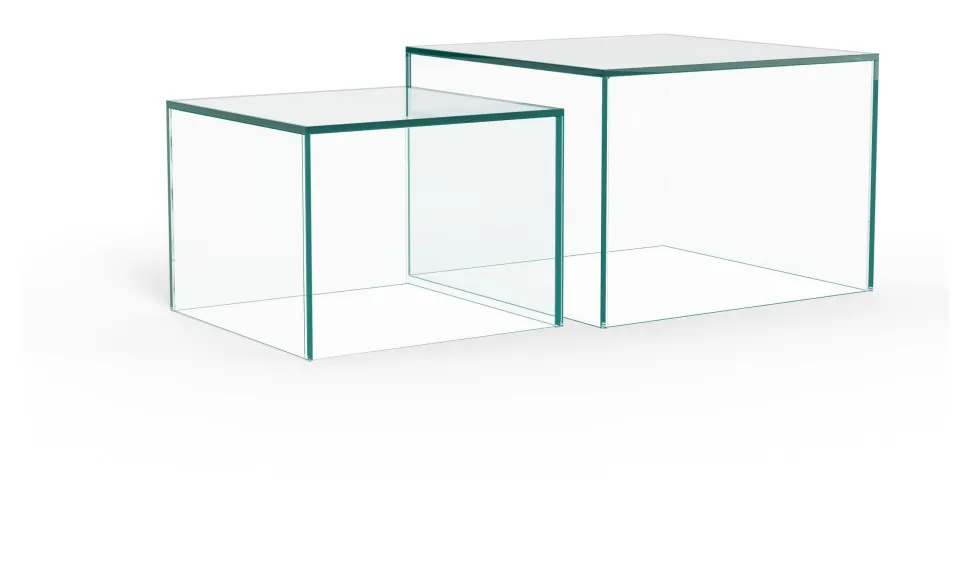 Deze vierkante salontafelset is volledig gemaakt van helder gehard glas en zal de woonkamer opfleuren. De set bestaat uit twee vierkante tafels in twee maten, die verschillende stylingopstellingen en doeleinden bieden. Of ze nu op zichzelf staan of samen, ze brengen een gelaagde, lichte look in elke ruimte.