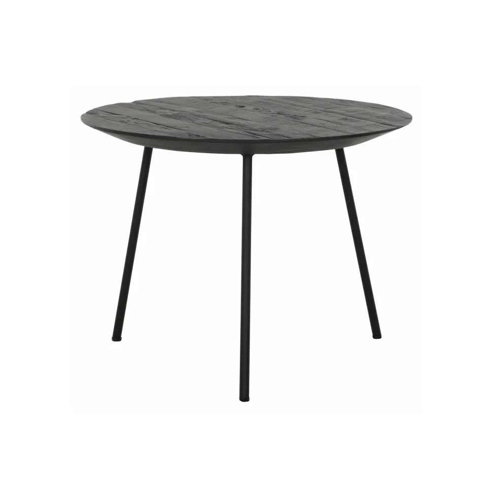 Het tafelblad van DTP Home Salontafel Jupiter is gemaakt van teakhout. Het tafelblad heeft een aflopende rand, richting de poten. De 3 zwart metalen poten dragen het tafelblad. De afmetingen zijn 37xØ50 cm.