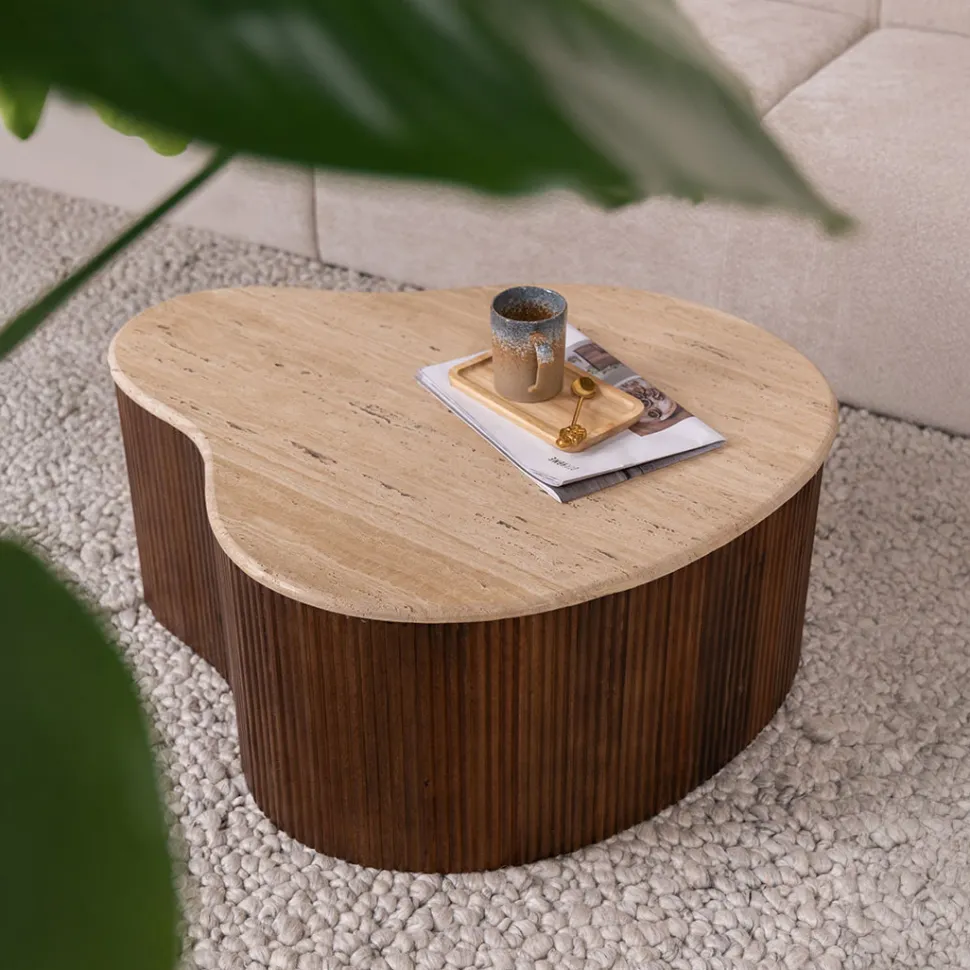 Creëer een stijlvolle en trendy zithoek met salontafel ‘Mari’. Het travertin tafelblad in combinatie met het mangohouten onderstel en de organische vorm zorgen ervoor dat het een echte aanwinst is voor in jouw interieur. De salontafel is ook nog eens makkelijk schoon te maken door zijn travertin tafelblad.