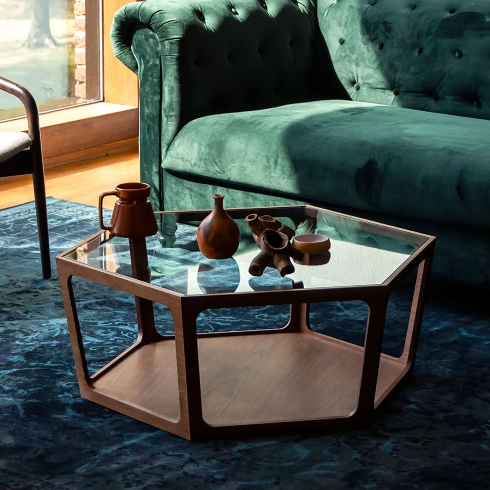 De Dutchbone Sita is zo’n typisch meubel, waarover je altijd vragen krijgt. Is het een familie-erfstuk, is het een designklassieker? Beide had zomaar gekund. Toch is deze salontafel ondanks de vintage uitstraling, gemaakt van moderne materialen van de hoogste kwaliteit. Het donkere walnootfineer blijft jarenlang mooi en geeft bovendien een prachtige, warme uitstraling. Daarnaast zorgen de unieke hexagon vorm en glanzende glasplaat voor een karakteristiek tintje. De perfecte tafel tijdens een sfeervolle avond vol snacks, goede wijn en gezelligheid met vrienden en familie.