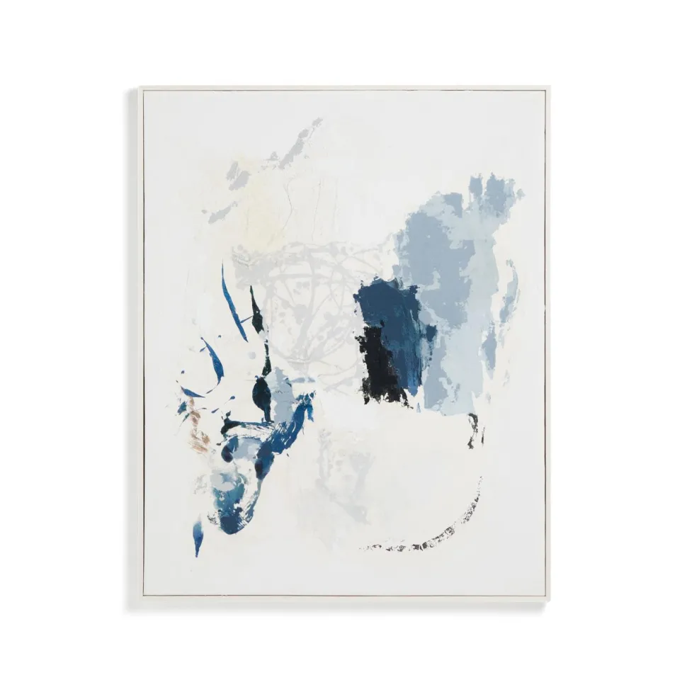 Het Erale schilderij combineert grijze en blauwe tinten in een abstracte compositie die opvalt door de verschillende texturen die over het oppervlak lopen. De lijnen overlappen elkaar op een onregelmatige manier, waardoor een werk met visuele diepte en een sereen karakter ontstaat. Omdat het met de hand geschilderd is, heeft elk schilderij kleine variaties die het uniek maken. Inclusief lijst met D-ringhanger, die geschikt is voor verschillende soorten muren en het ophangen vergemakkelijkt.