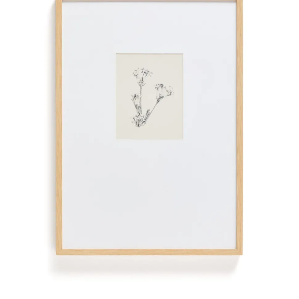 Dit schilderij valt op door de gedrukte illustratie in botanische stijl, uitgevoerd in potlood met een patroon dat doet denken aan traditionele graveertechnieken. Elke streek weerspiegelt de precisie en delicatesse van klassieke botanische tekeningen en brengt karakter en verfijning in de kamer. De illustratie is gevat in een breed passe-partout dat hem omlijst, voor elegantie zorgt en de afbeelding laat ademen, voor een evenwichtig en tijdloos visueel effect. Een veelzijdig werk voor wie op zoek is naar decoratieve kunst met een subtiele aanwezigheid.
