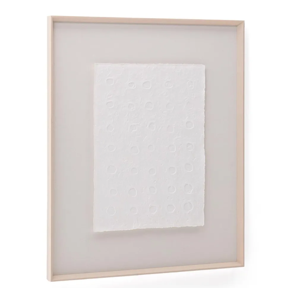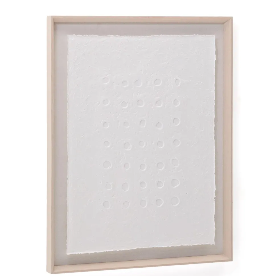 Het Olvin schilderij is gemaakt van wit gerecycled papier, met unieke handgemaakte reliëfs die opvallen door hun authentieke karakter. Elk exemplaar is het resultaat van een druktechniek die een gecentreerd patroon van stippen en cirkels creëert, wat textuur en dimensie geeft aan het ontwerp. De strakke afwerking maakt het een ideale keuze om een artistiek en origineel detail toe te voegen aan elke ruimte. Het is ook perfect te combineren met de andere schilderijen in de collectie, zodat u harmonieuze visuele composities vol karakter kunt creëren. Elk reliëf weerspiegelt de toewijding in de uitwerking ervan, waardoor dit werk een decoratieve aanvulling is die duurzaamheid en eigentijds design combineert.