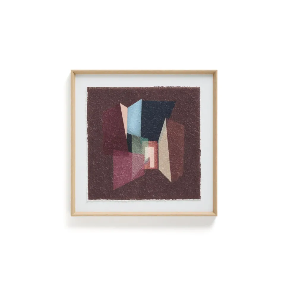 Dit schilderij is geïnspireerd op de kubistische stijl en architectuur uit het midden van de vorige eeuw. Het brengt diepte en karakter in elke omgeving dankzij de combinatie van geometrische vormen en een palet van grijze en bordeauxrode tinten. In dit ontwerp wordt architectuur gedeconstrueerd en gesynthetiseerd om het te weerspiegelen in een uniek artistiek kunstwerk, waar de superpositie van vlakken en het spel met transparanties een visueel effect creëren dat uitnodigt tot contemplatie en een punt van hedendaagse verfijning toevoegt. Het werk is afgedrukt op gerecycled papier en elk detail en elke textuur versterkt de artistieke kwaliteit. De lijst met strakke lijnen zorgt voor visuele lichtheid en laat het werk op zichzelf staan, zodat het gemakkelijk te combineren is met verschillende decoratiestijlen.