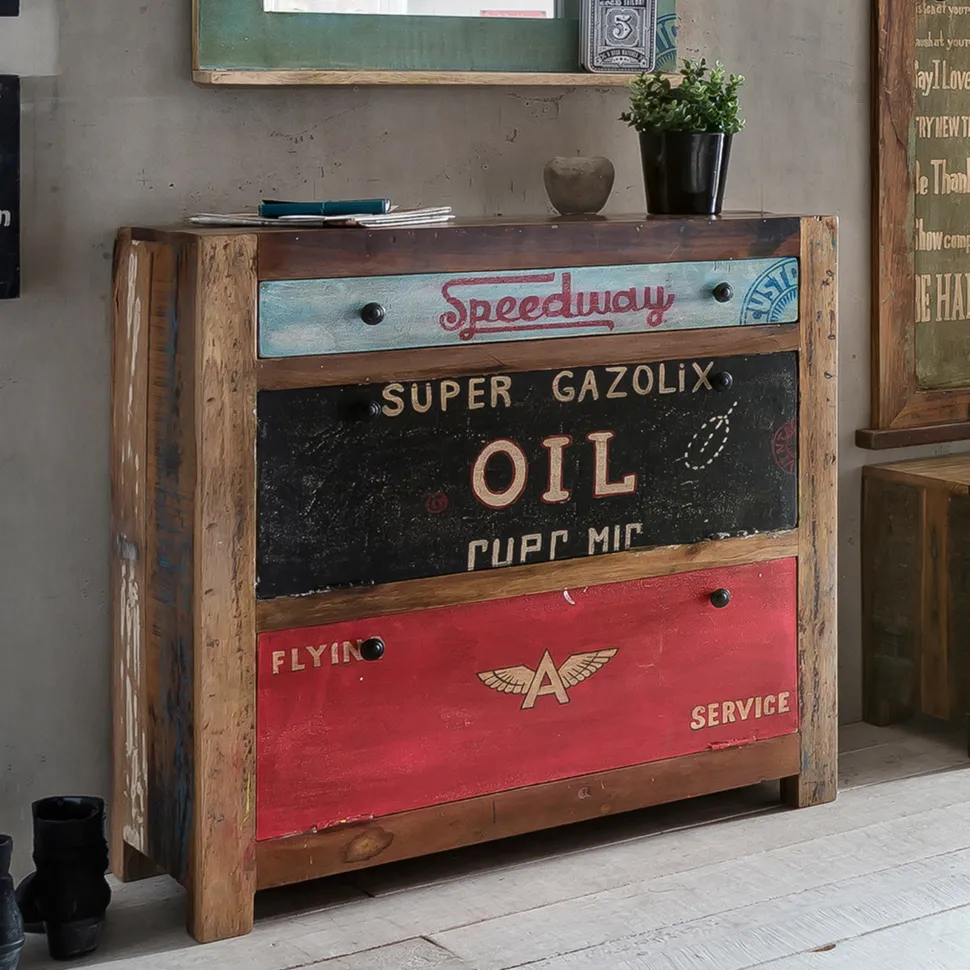 Deze schoenenkast geeft je garderobe een gevoel van hete rijp en luide motoren en zorgt voor orde in het leven van je schoenen. Het begin van de populaire motorsport wordt vastgehouden in het ontwerp van de schoenentip. Achter de kleppen voorzien van twee knopgrepen gaat voldoende ruimte schuil voor sportschoenen, sandalen, slippers, sneakers, kinderschoenen enz. Aan de voorkant van de kast is oude reclame bevestigd uit de tijd van het racen en geeft een extra charme. De lade biedt weer extra ruimte. De kast van gerecycled afvalhout is zeer stabiel. De afdekplaat van de Dielenkommode nodigt uit tot decoreren. Als losse kast of gecombineerd met andere garderobemeubels is deze schoenenkleed veelzijdig. Ook gedecoreerd met een spiegel eraan vast of steeds weer is de schoenenkipper in gang en hal een Eyecatcher.