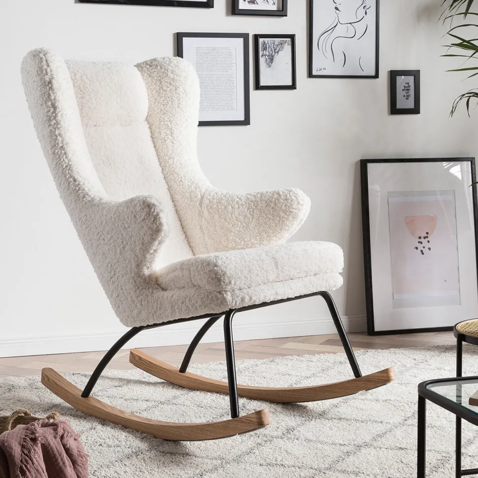 Deze gezellige schommelfauteuil presenteert zich in het trendy Scandinavische ontwerp. Hij biedt een moderne uitstraling met klassieke elementen en zijn gebogen lijnen maken hem tot een blikvanger. De decoratieve zitting heeft een extra hoge rugleuning in de stijl van de vleugelstoel. Direct hiermee verbonden zijn de comfortabele armleuningen in een uitlopende vorm. Ze harmoniëren perfect met het zitkussen, dat naar voren toe afgerond is. Door de aangename bekleding biedt de schommelstoel veel zitcomfort. De aaibare bekleding van teddybont, die zacht aanvoelt, draagt daar ook toe bij. De fauteuil is gecombineerd met lopers van massief hout, die stevig verbonden zijn met het stabiele frame van gepoedercoat metaal.