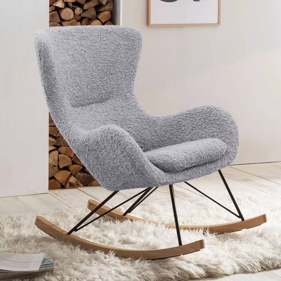Meubels van teddybont zijn een gezellige woontrend die de woonkamers van designliefhebbers verovert! De schommelstoel in Scandinavische stijl maakt indruk met zijn zachte bekleding van teddybont. Terwijl het frame is gemaakt van zwart gepoedercoat metaal, zijn de twee rails gemaakt van massief hout met eiken fineer. Dit frame zorgt niet alleen voor een gelijkmatige gewichtsverdeling en een mooie beweging van de fauteuil, maar harmonieert ook perfect met de stoffen bekleding. De comfortabele bekleding, armleuningen en het extra dikke zitkussen zorgen voor ontspanning en comfort van een klasse apart. De schommelstoel maakt indruk met zijn opvallende uiterlijk, kwaliteit en duurzaamheid. Maak van deze schommelstoel je nieuwe favoriete plekje en geniet van de gezelligheid tijdens het lezen of tv kijken.