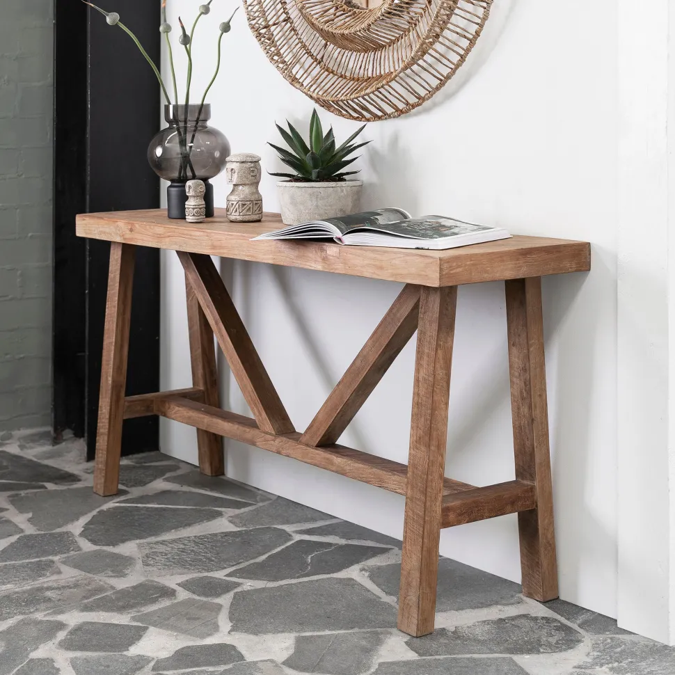 Wandtafel Monastery is gemaakt van gerecycled teakhout, een duurzaam houtsoort. Hierdoor is elke wandtafel uniek. Het blad van de wandtafel is 6 cm dik en heeft verstek gezaagde hoeken. De afmetingen van de wandtafel zijn 76x150x40 cm.