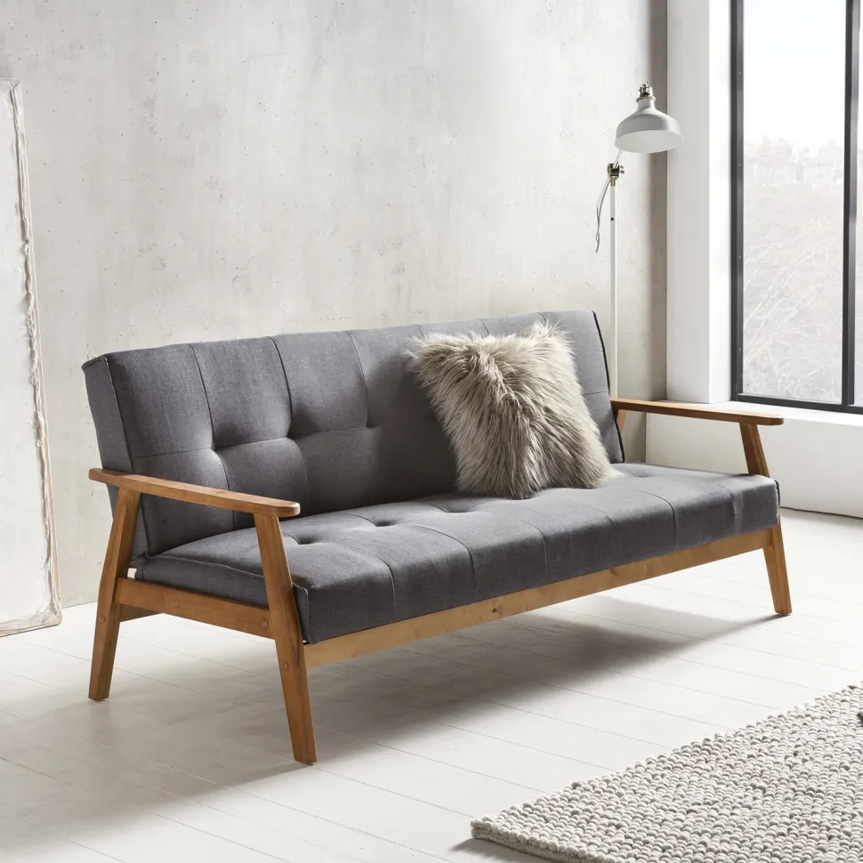 De slaapbank met armleuningen in Scandinavische stijl presenteert zich met een stijlvolle bekleding van structuurstof en een stabiele massief houten constructie van eucalyptus. De afwerking op de zitting en rugleuning is bijzonder opvallend. Maar overtuigend zijn de 3 verschillende functies: zit-, chill- en ligfunctie. Met de 60-graden opklapfunctie van de rugleuning kan de bank in een chillpositie worden gezet, terwijl hij met de 180-graden functie in een ligpositie kan worden gebruikt. Twee steunpoten in de rugleuning zorgen voor een veilige ondersteuning als de bank is ingeklapt. Het stevige eucalyptushouten frame zorgt niet alleen voor een veilige stand, maar vormt ook een mooi contrast met de stof. De zit-, chill- en ligfunctie en de armleuningen geven je een ontspanningsfactor van een klasse apart. Dit designjuweeltje wordt niet alleen een visueel hoogtepunt in je huis, maar ook je nieuwe feelgoodplek.