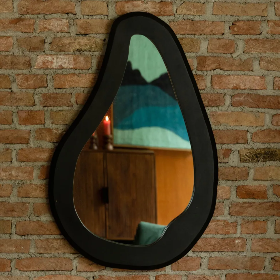 Turn a wall into the centrepiece of your interior with the Dutchbone Aren. With its special appearance, this wall mirror immediately catches your eye. The first thing you’ll notice is, of course, the organic shape and the wide frame. The frame is made of high-quality mango wood finished in a stylish black lacquer. The surface of the frame is not entirely smooth on purpose and features a small imperfection here and there. This gives it even more character with a fine, perfectly imperfect look. A look that fills the room with a warm ambience and provides a tough edge.