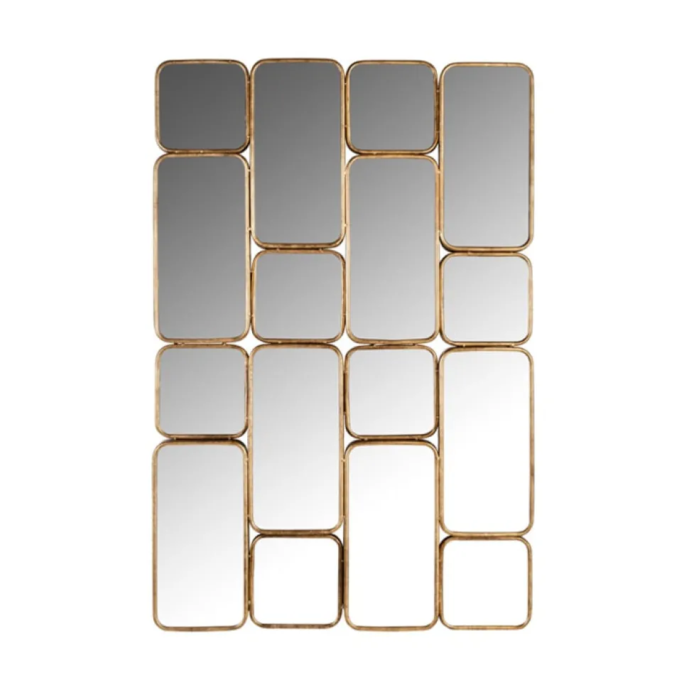 Spiegel ‘Birche’ van Richmond is een luxueuze spiegel die bestaat uit zestien losse spiegels, een combinatie van vierkante en langwerpige vormen, stijlvol samengebracht tot één geheel. Het slanke frame is gemaakt van ijzer met een verfijnde goudkleurige afwerking, wat een elegante en glamoureuze uitstraling geeft.